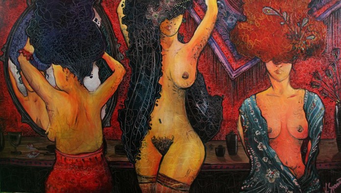 Corpi nudi, voluttuosi, seducenti. I soggetti sono chiari e schietti, è evidente che non vogliono nascondere neanche un impercettibile segno di ciò che è la loro esteriorità. Sembra di aver visto tutto di loro, ma qualcosa manca, l’occhio, lo specchio che rivela l’animo della persona ed il suo vero essere, in queste figure non si vede. Si nasconde sotto una benda, dietro una ciocca di capelli, oppure si perde oltre i confini della tela, per farci notare che l’apparenza non basta a capire chi abbiamo davanti.