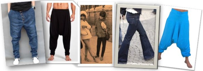 pantaloniNegli anni sessanta erano a tubo, corti e con i calzini bianchi che si intravedevano. Negli anni settanta ecco che diventano a “zampa di elefante” e tutti a gara per avere le “Zampe” più larghe, a volte con inserti colorati per aumentarne le dimensioni. E poi di nuovo stretti e poi larghi e poi… un continuo cambiare.