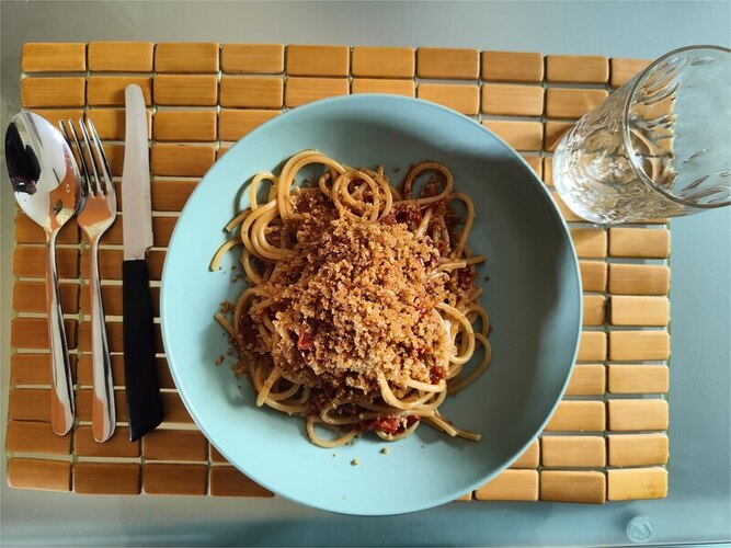 Un segreto: Se vuoi una nota agrodolce, aggiungi alla mollica tostata un cucchiaino di zucchero prima di spolverarla sulla pasta. È un contrasto tipico della zona di Palermo!