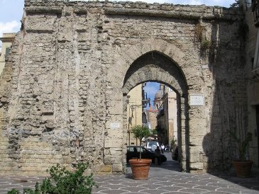 Si tratta di una Porta in tufo, con fornice a doppio arco ogivale all’esterno e a sesto ribassato all’interno e rappresenterebbe una delle espressioni più antiche della cinta muraria medievale.